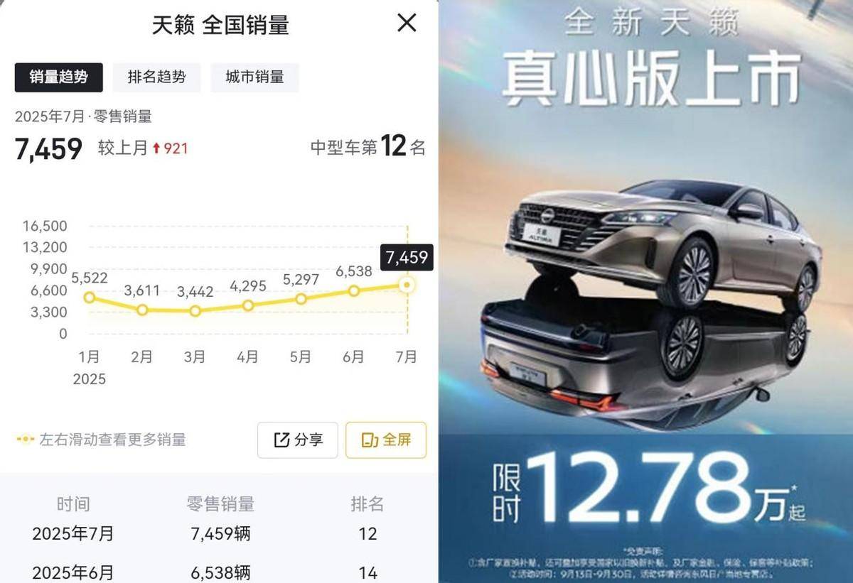 东风日产天籁作为一款日系中型轿车,自从推出了售价12.78万元的真心版车型后,其销量便一路开始上涨。在今年3月份,它还仅只有3442辆新车的月销量数据进账,而在刚过去的7月,其便取得了7459辆新车的销量成绩单,由此可见,降价对天籁车系销量的提升确实起到了决定性的作用。