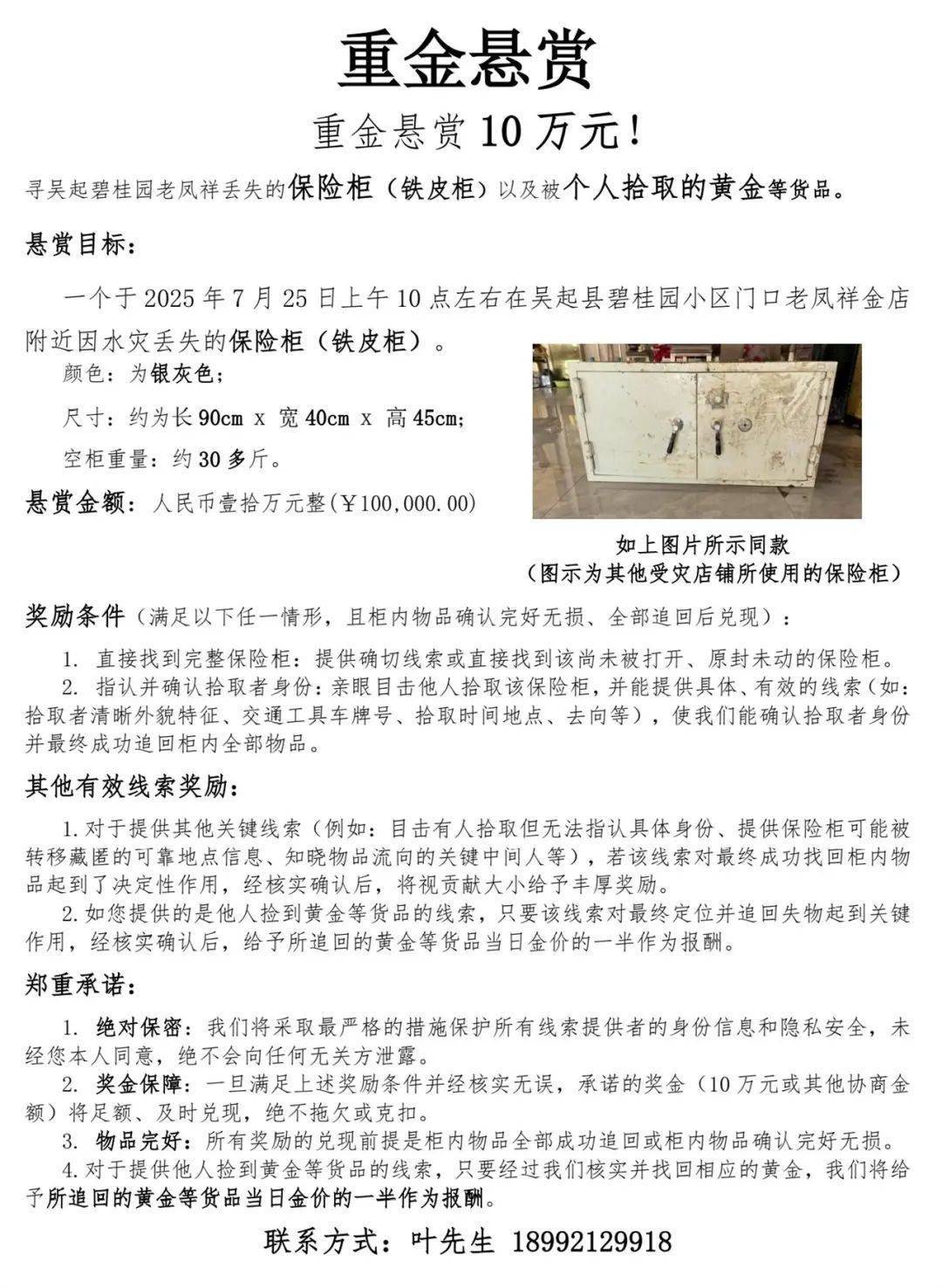 叶国福表示,金店丢失的保险柜为银灰色,尺寸为长90厘米、宽40厘米、高45厘米,空柜重量30多斤。保险柜里的财物价值在150万元左右。经协商,店方决定公开悬赏,寻找保险柜的线索。帮助直接找到完整保险柜或追回柜内全部物品者,最高奖励10万元人民币。对于提供其他关键线索者,经核实确认后,将视贡献大小给予丰厚奖励。对于提供他人捡到金饰线索的人员,经核实并找回相应金饰的,店方将给予所追回金饰当日金价的一半作为报酬。